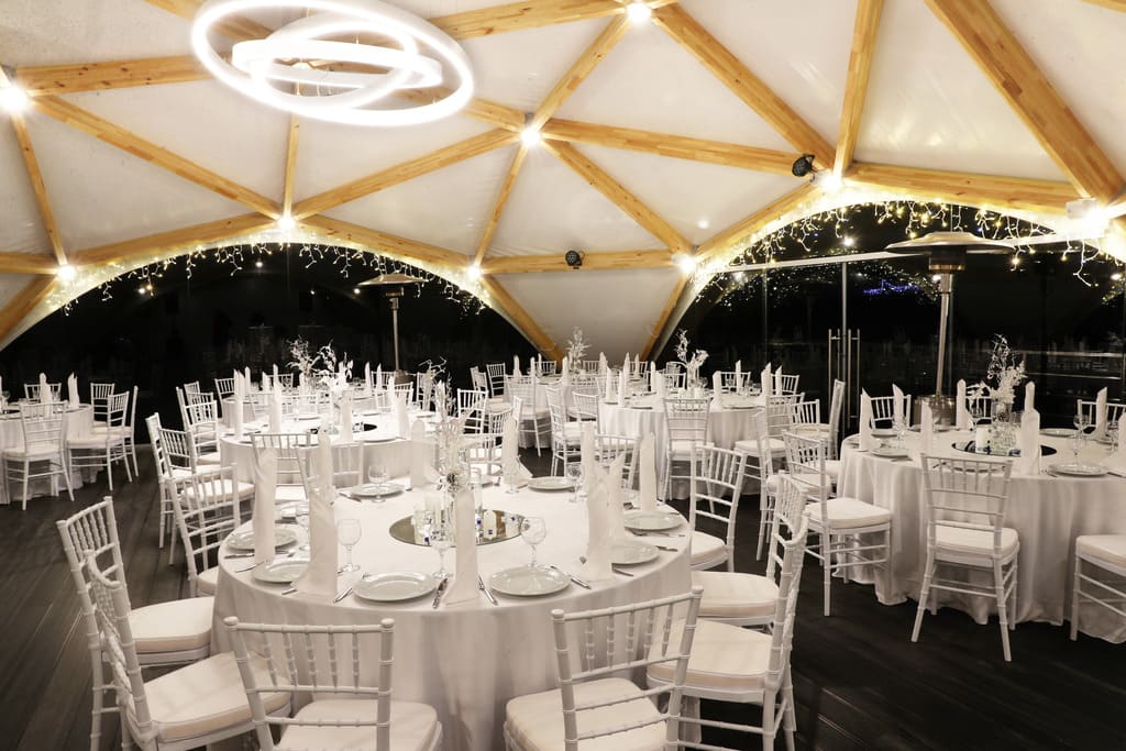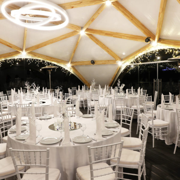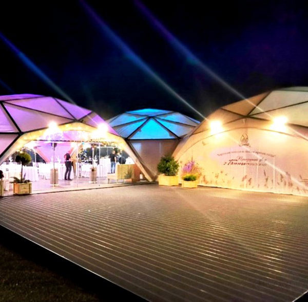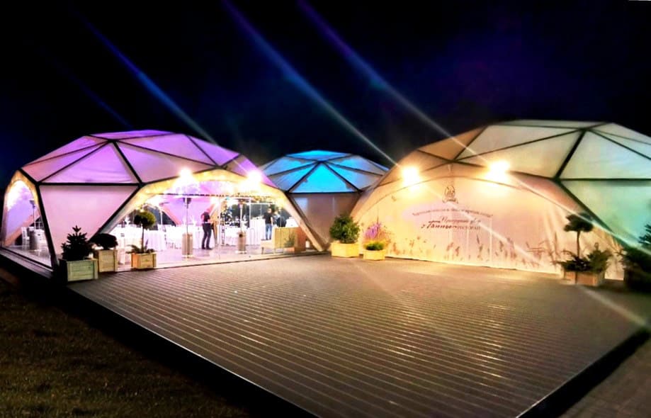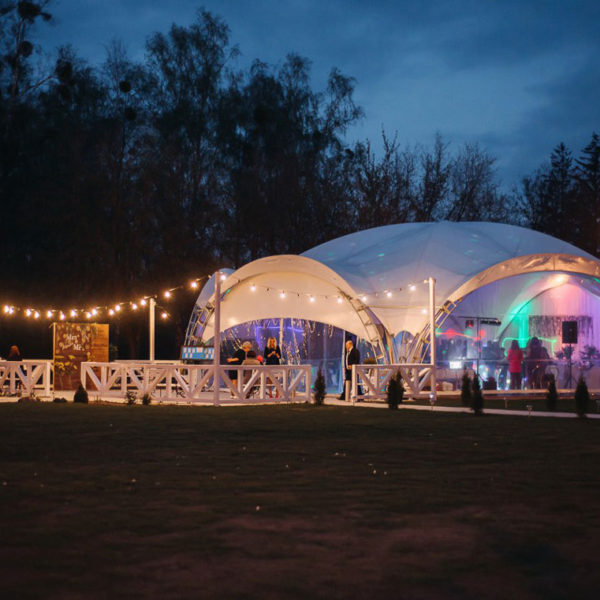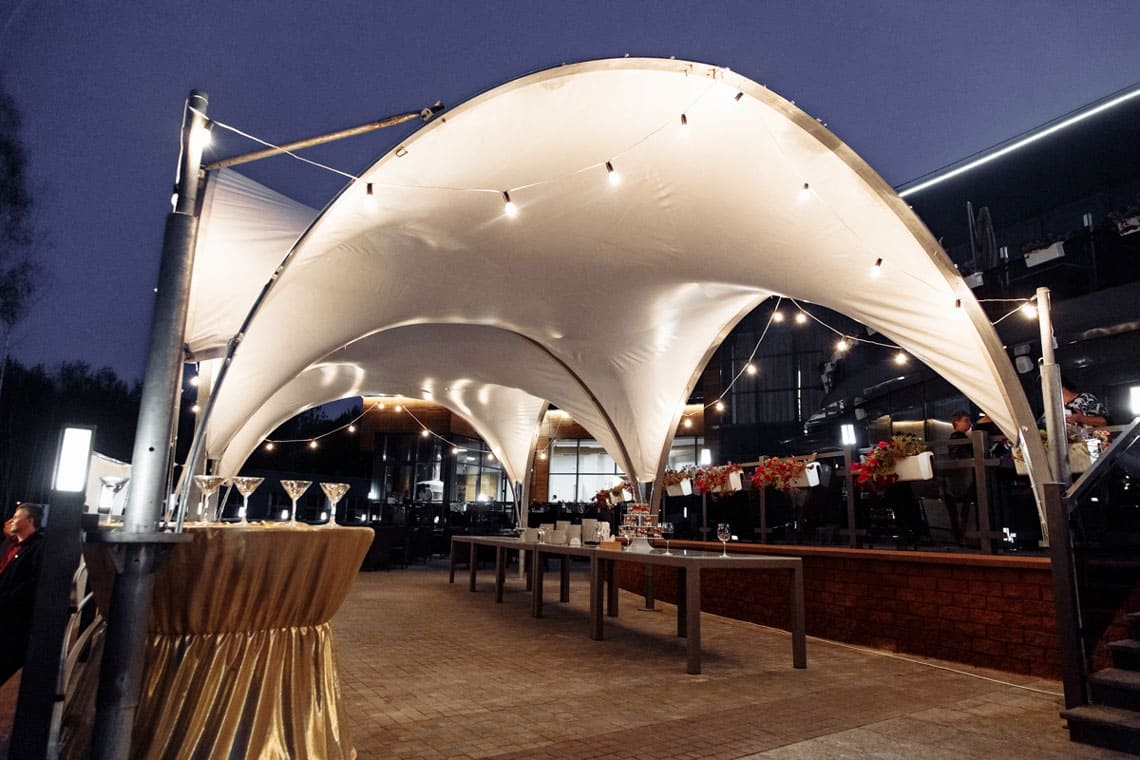 Bei LUXTENT können Sie Dekorationsleistungen bestellen, die (je nach Ihren Wünschen) Folgendes umfassen: Verschönerung der Kuppel und der Wände mit Designerstoffen sowie Gestaltung des Raums innerhalb und außerhalb des Pavillons mit lebenden und künstlichen Pflanzen.